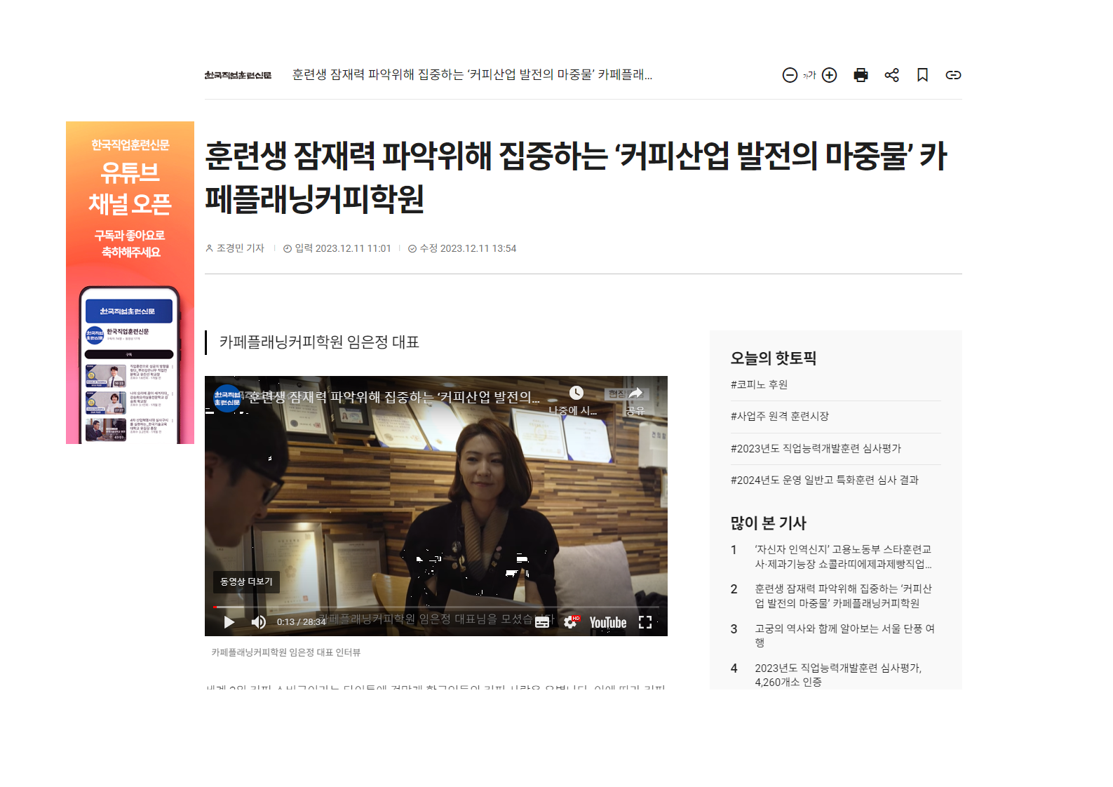 < 훈련생 잠재력 파악위해 집중하는 '커피산업 발전의 마중물' 카페플래닝커피학원 > 이라는 제목으로 한국직업훈련신문 https://www.hrdenews.com/ 홈페이지에 게시된 임은정 대표의 인터뷰 기사와 유투브 채널을 공유드립니다.