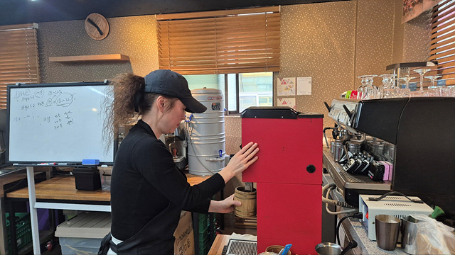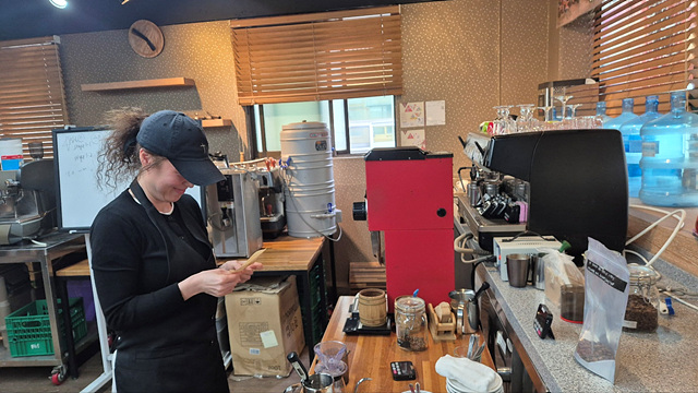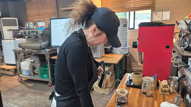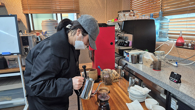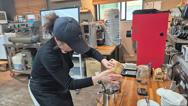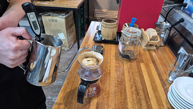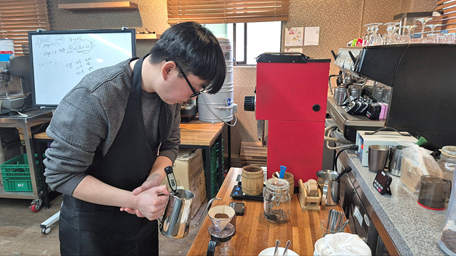 물의 온도를 체크하면서 싱글 오리진 원두를 핸드드립으로 추출하며